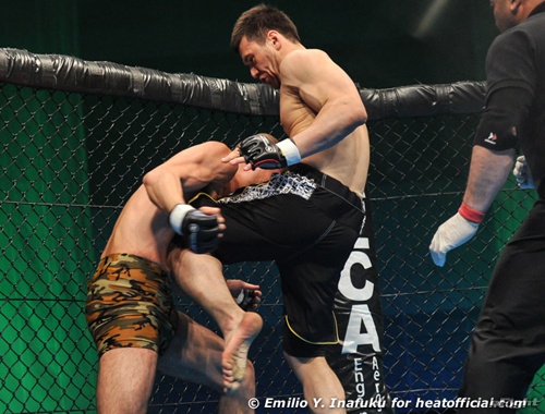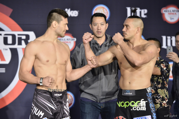 計量後に向き合って闘志を燃やす加藤久輝(左)とA.J.マシューズ(右)