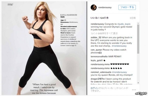 リオ五輪でハリソンが金メダルを獲得した際に、ラウジーがSNSに投稿したハリソンへの祝福メッセージと写真