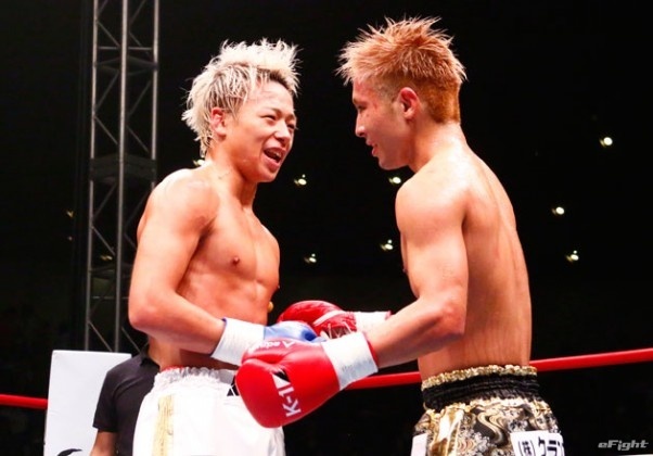 試合後に小澤(右)と言葉を交わす武尊(左)