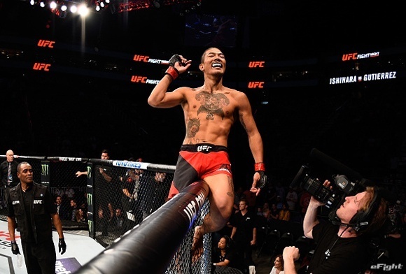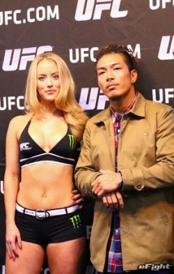 昨年のUFC日本大会にて、ラウンドガールを務めた”美しすぎる妻”ことマイコラス夫人(左)と念願の対面を果たした石原(右)