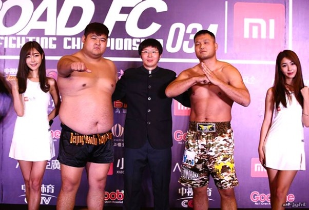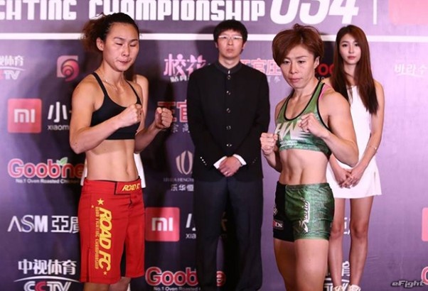 藤野恵実(右)と対戦相手のヤン・シャオナン(左)はともに52.4kgで計量パス
