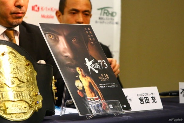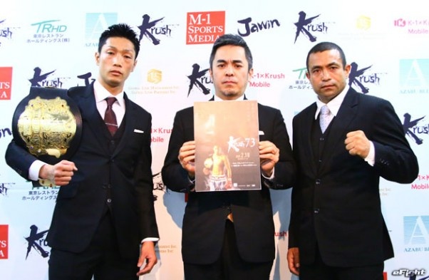 塚越(左)の初防衛戦の相手はモハン(右)に決定。中央は宮田プロデューサー