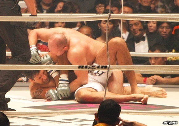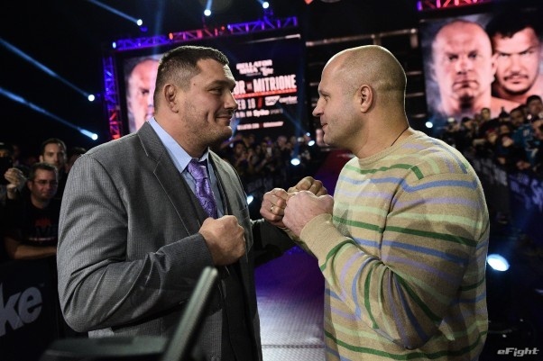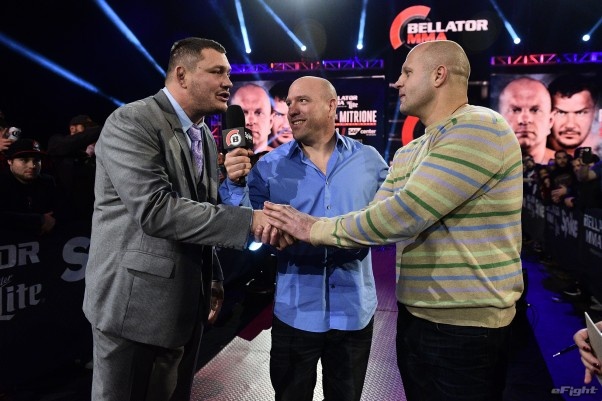 11月19日の『Bellator 165』の会場でヒョードル(右)と対面したミトリオン(左)