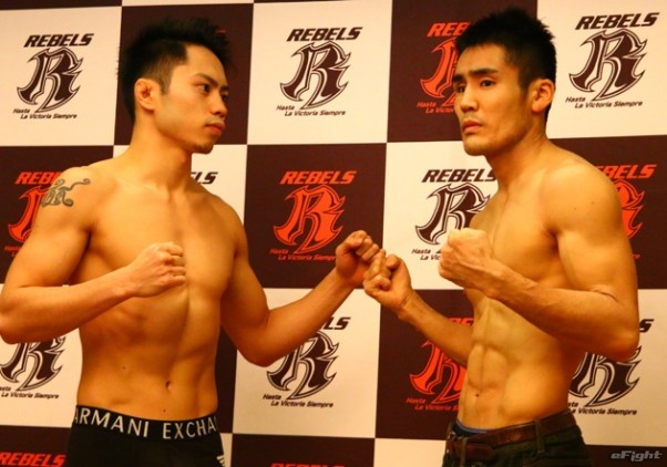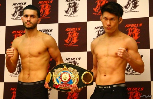 BLADE61kg級世界王者決定戦で対戦するREBELS 60kg級王者・町田光(右)とイリアス・エナッシ(左)