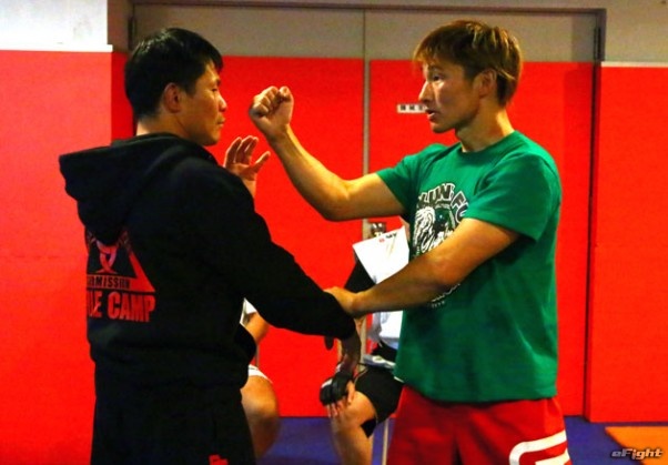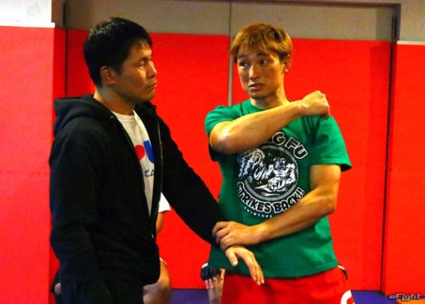 中国拳法の瀬戸(右)からジークンドーの戦い方のレクチャーを受ける田村(左)