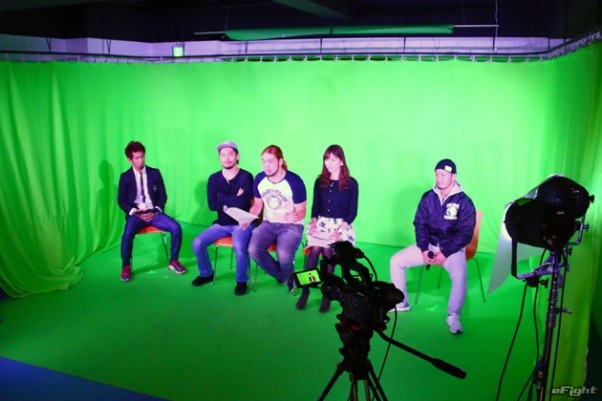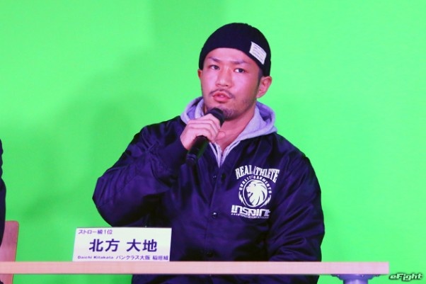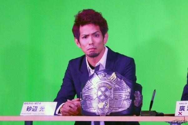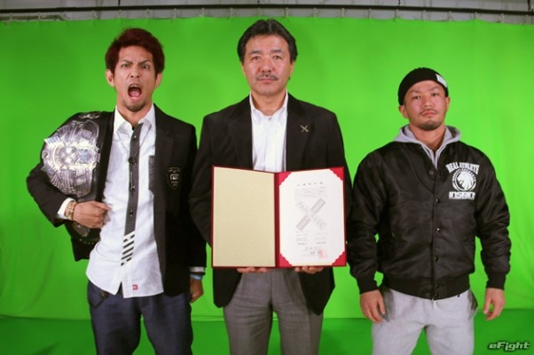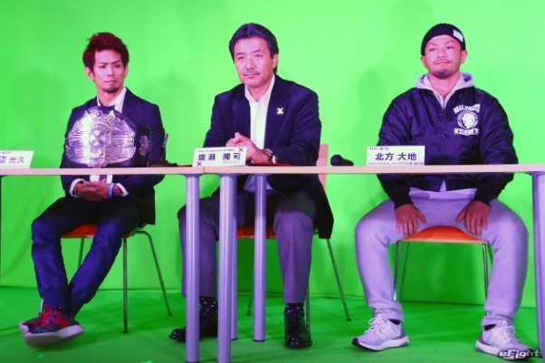 ストロー級タイトルマッチを戦う王者・砂辺光久(左)と挑戦者・北方大地(右)。中央は廣瀬隆司コミッショナー