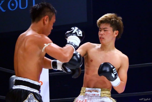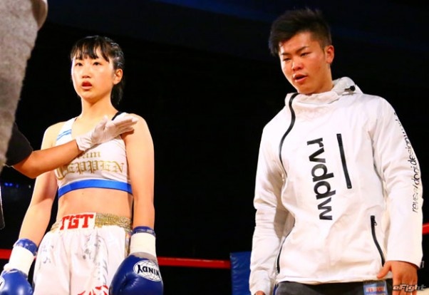 無敗の女子高生キックボクサー・寺山(左)のセコンドに就いた那須川(右)