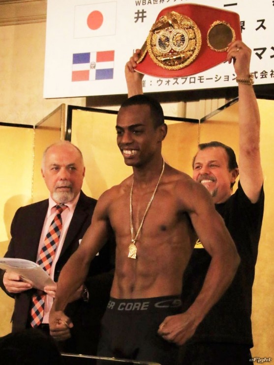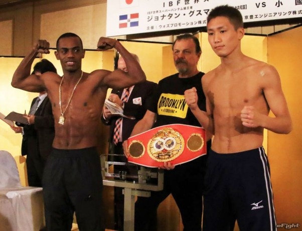 IBF世界スーパーバンタム級タイトルマッチで対戦する、王者グスマン(左)と小國(右)