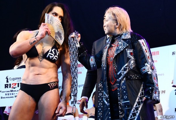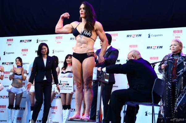 ガルシア(左)と堀田(右)が計量会場に睨みあう