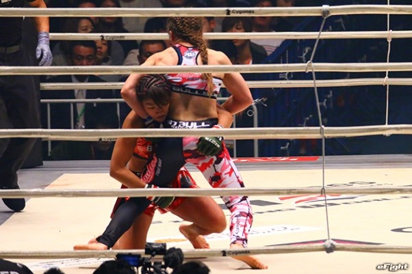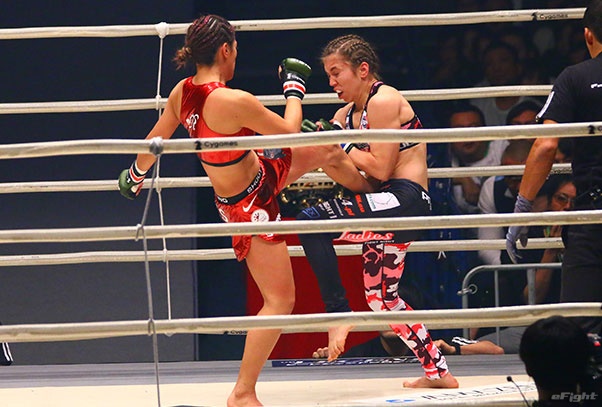 三日月蹴りで鮮やかなKO勝ちを飾ったRENA(左)
