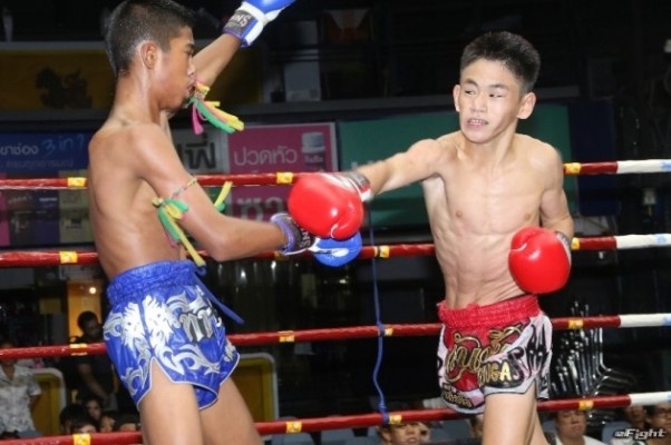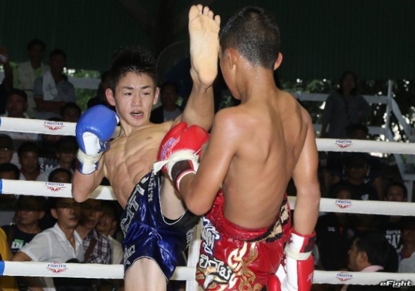 地元の有力若手選手ヨードイーティー(右)にTKO勝ちを収めた佐藤(左)