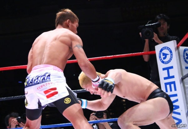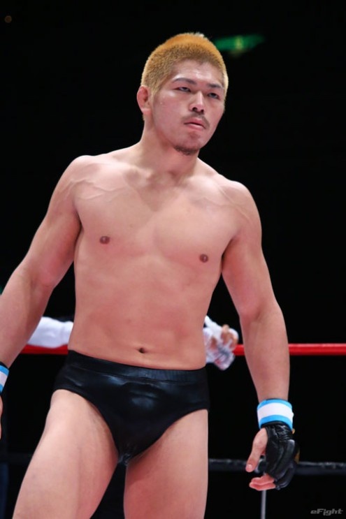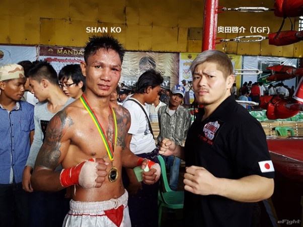 地上で最も過激な格闘技ラウェイに初挑戦するプロレスラーの奥田(右)。左が対戦相手のSHAN KO