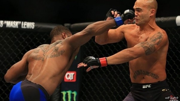 ロビー・ローラー(右)を豪快右フック一発でマットに沈めたウッドリー(左)
