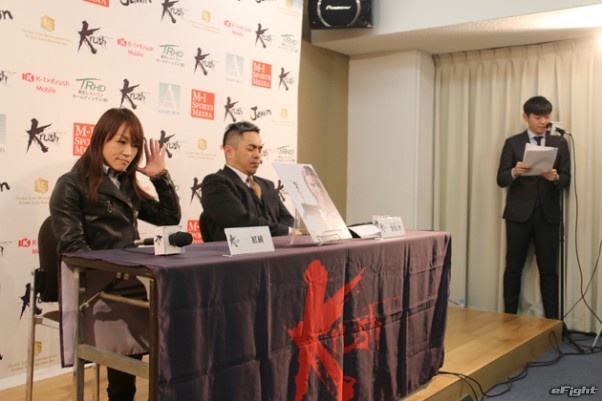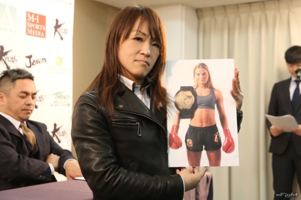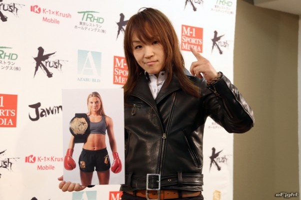 王者メロニーの写真パネルを手に、気合いの入った表情を見せる紅絹