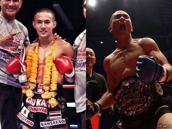 マサ佐藤(左)は英雄伝説アジア64kg級王者、西日本統一ライト級王者、DBSライト級王者、元RKAライト級王者。ダイスケ(右)はTENKAICHI KICK ライト級王者