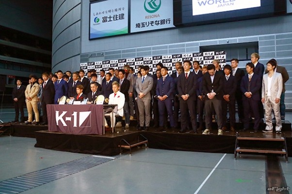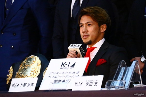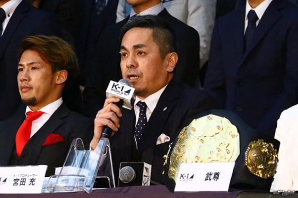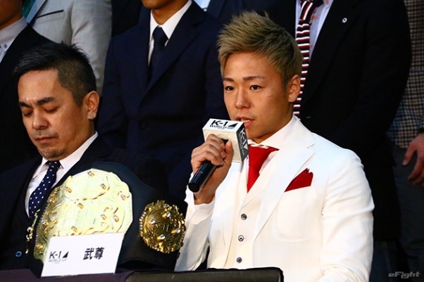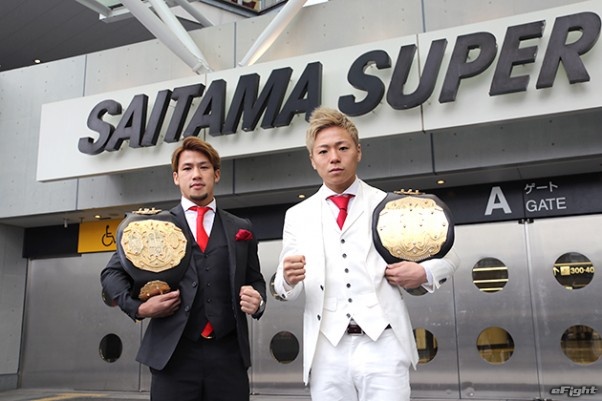 さいたまスーパーアリーナを背に、闘志を燃やす武尊(右)と卜部弘嵩(左)の両王者