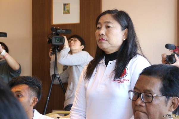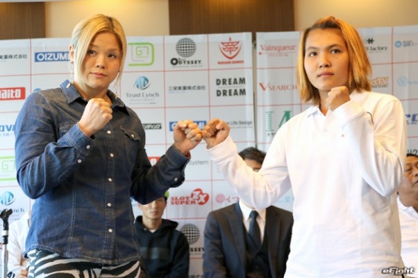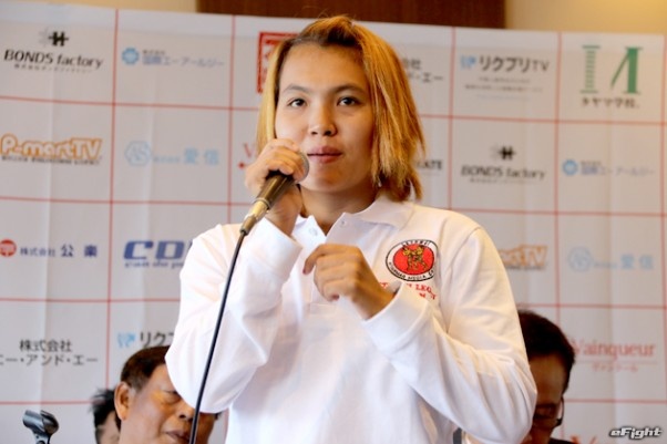 日本初の女子ラウェイ公式戦で拳を交える高橋奈七永(左)とシュエ・シン・ミン(右)