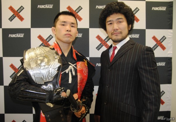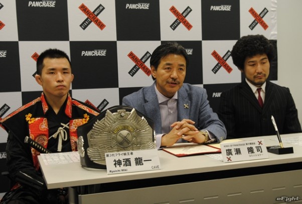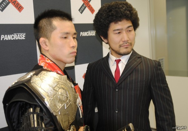 タイトルマッチ調印式に臨んだ王者・神酒龍一(左)と挑戦者のマモル(右)