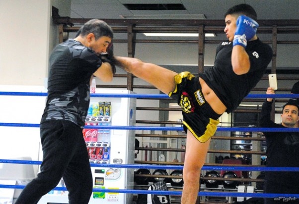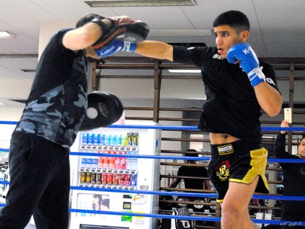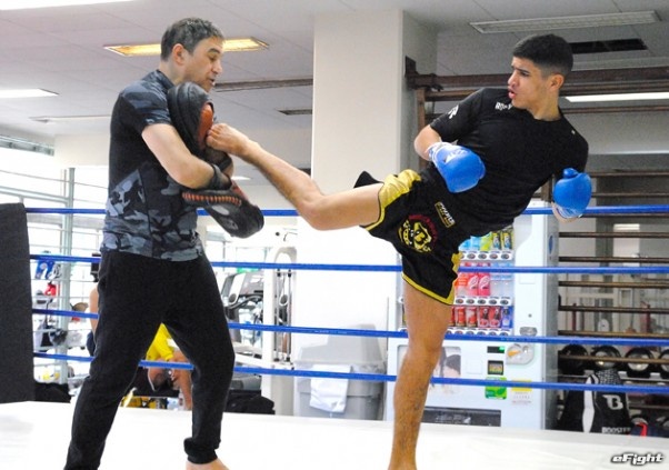 公開練習のミット打ちで後ろ蹴りを2度見せたスマイリ。この技で何度もダウンを奪っているという
