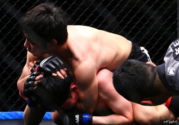 斎藤と同じく、昨年4月大会ではスリーパーで一本勝ちを収めた宇野(下)