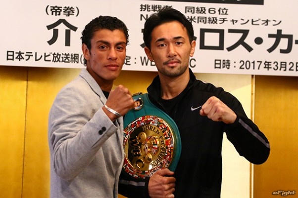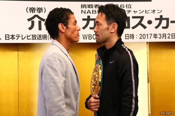 WBC世界バンタム級タイトルマッチで対戦する王者・山中慎介(右)と挑戦者カルロス・カールソン(左)