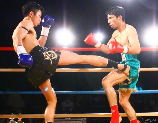 昨年12月にはNKBバンタム級3位前島マルコスを初のヒジありルールで破ったホープの小嶋(左)