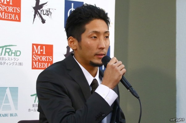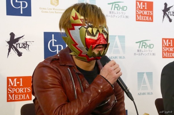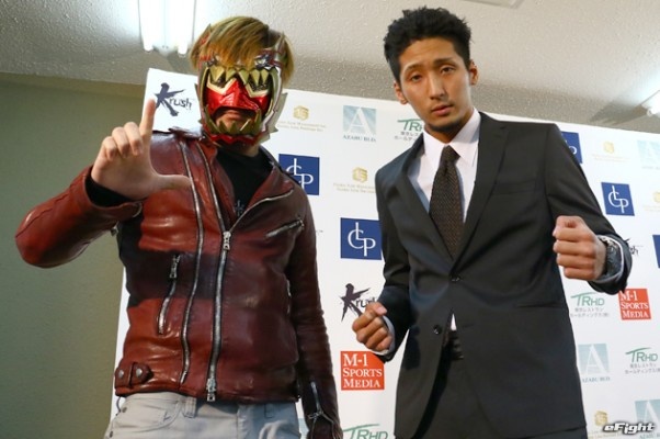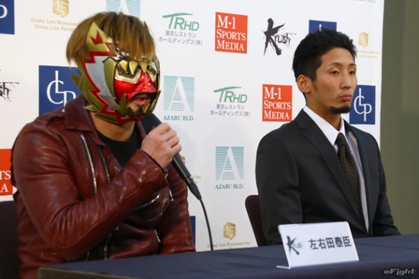 オリジナルマスク着用で会見に臨んだ左右田(左)と対戦相手の松下(右)