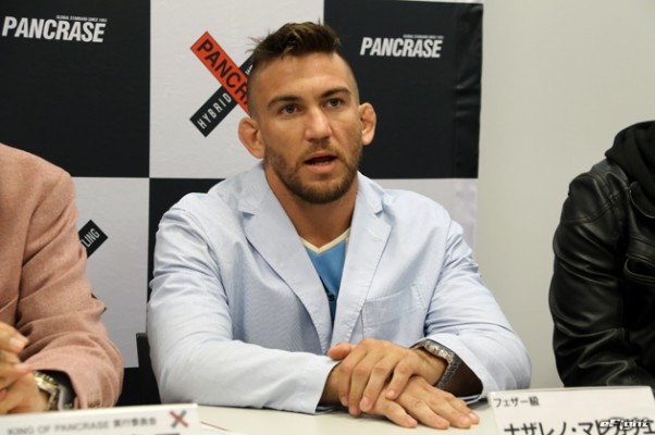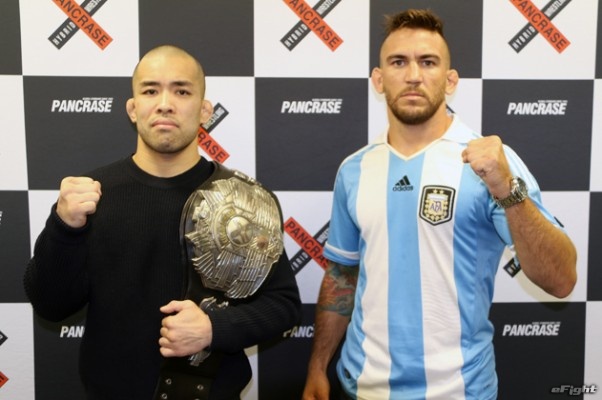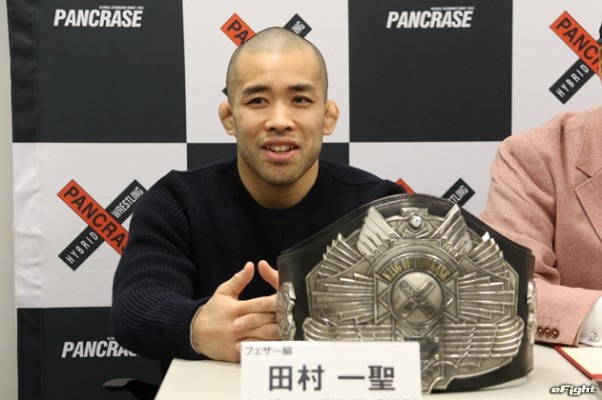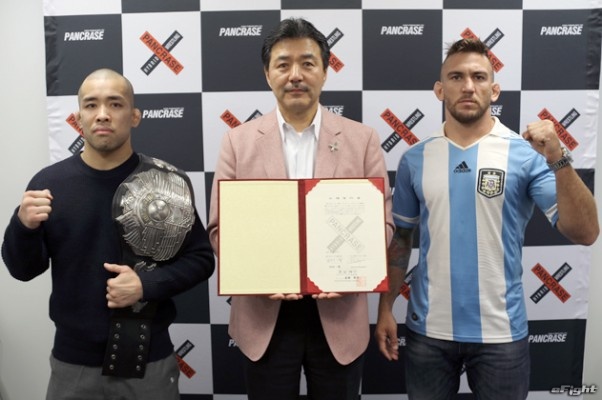 パンクラス・フェザー級タイトルマッチで激突する王者・田村(左)と挑戦者マレガリエ(右)。中央は廣瀬隆司コミッショナー