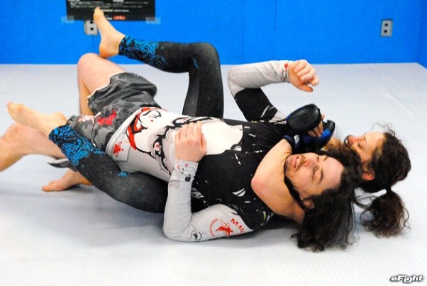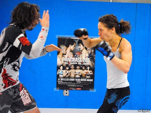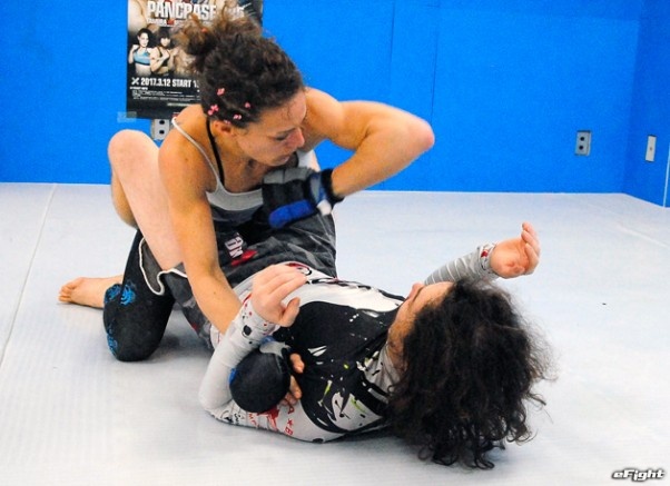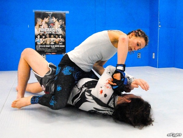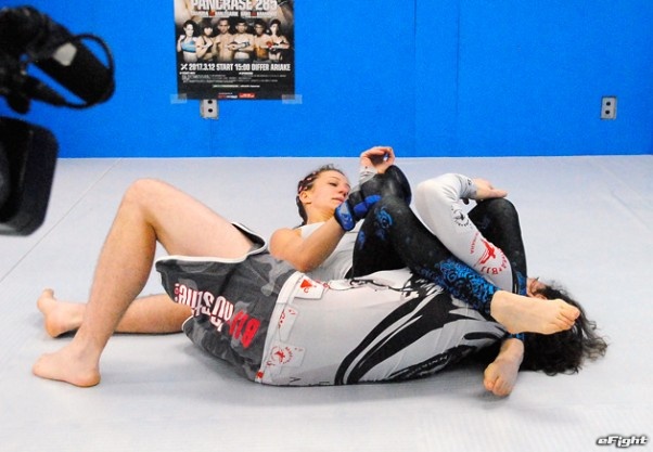 得意のチョークスリーパーで“戦う西内まりや”こと三浦彩佳の首を狙う