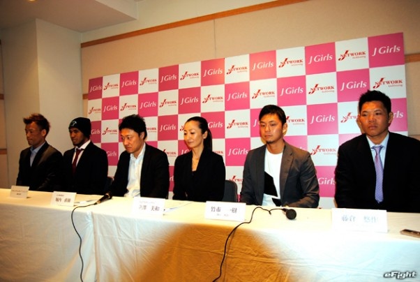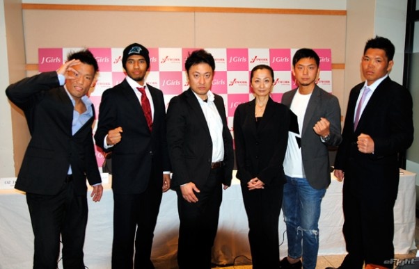 挑戦者決定トーナメントに出場する(左から)CAZ、ベイノア、竹市、藤倉。中央は左が堀内・大会事業部長、右が立澤・大会プロデューサー