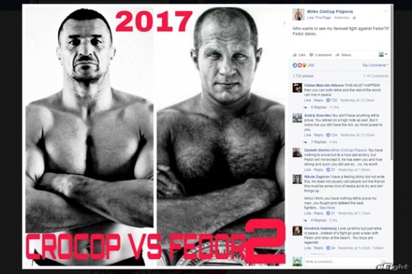 ミルコがSNSに投稿したヒョードル戦をアピールするような写真とメッセージ(ミルコのフェイスブックより)