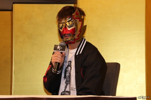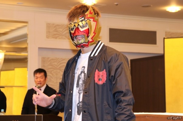 大のプロレスファンでもある左右田は、お馴染みのオリジナルマスクを着用して会見に出席した