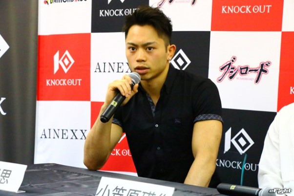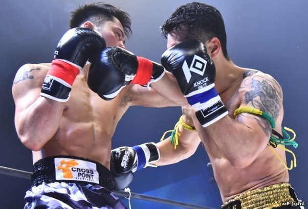 水落(右)をヒジ打ちでTKO負けに追い込み、ひとつの引き分けを挟んで12連勝を飾った不可思(左)