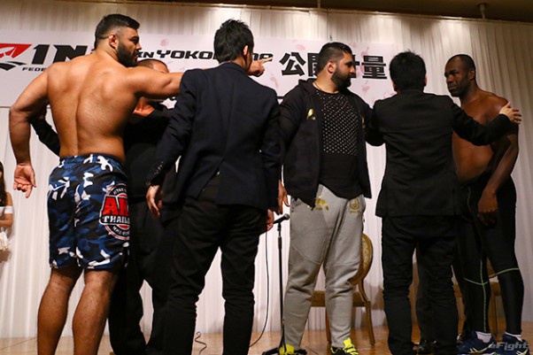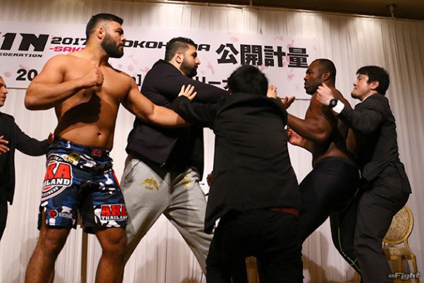 関係者に制止されるアリアックバリ(左)とドス・サントス(右)