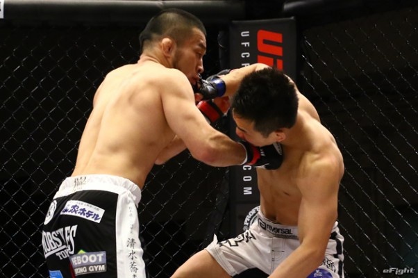 3月大会で強烈な右フックで大里洋志(右)をKOした清水(左)