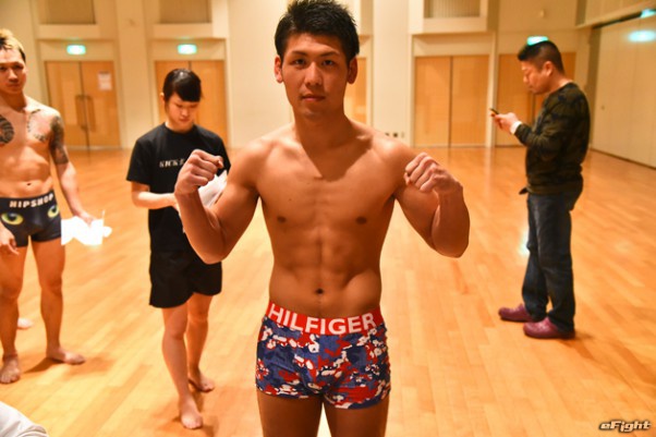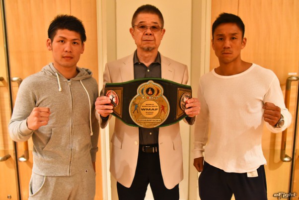 WMAF世界スーパーライト級王座決定戦で対戦する恭士郎(右)と石田勝希(左)。中央は4月1日付けでMA日本キックの代表に就任した小島保則氏