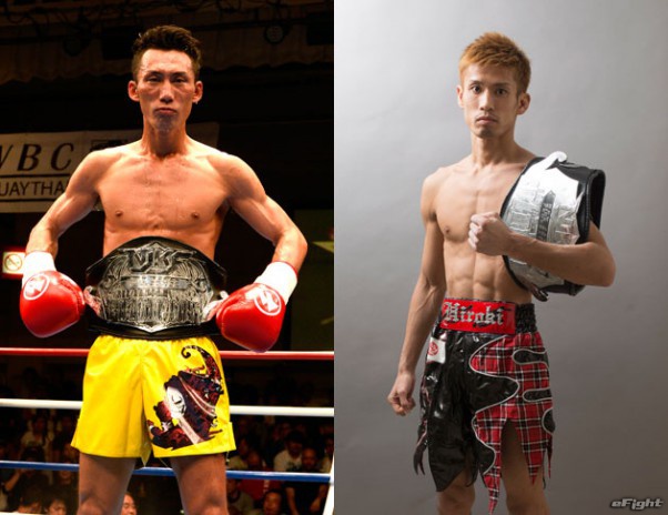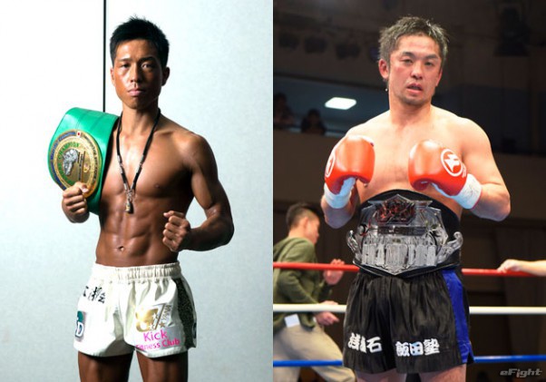 健太(左)が浅瀬石(右)を挑戦者に迎えてWBCムエタイ日本王座の初防衛戦を行う