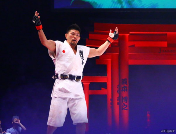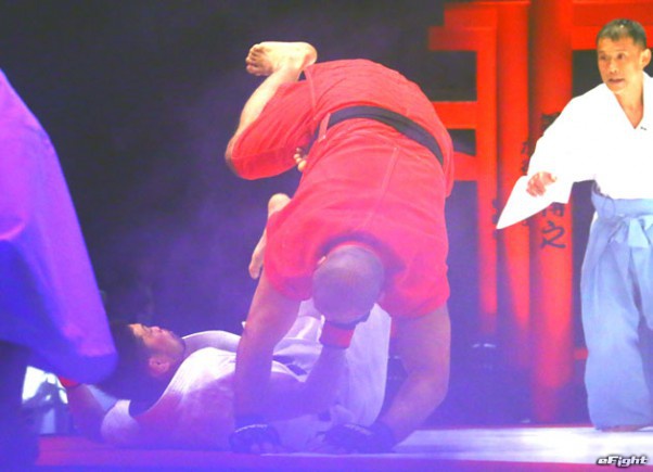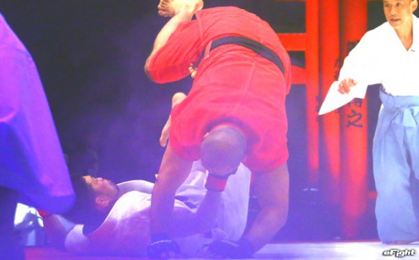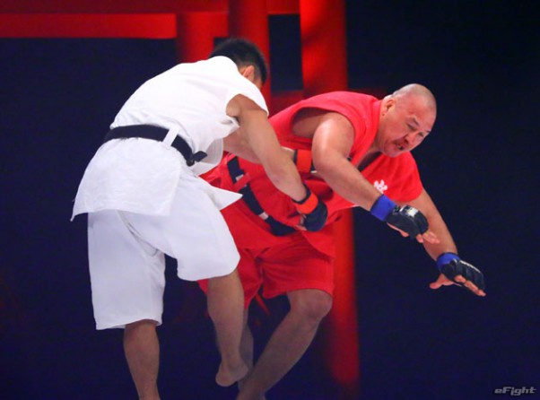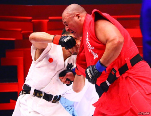道衣をつかんで相手のバランスを崩しながらパンチも入れる小見川