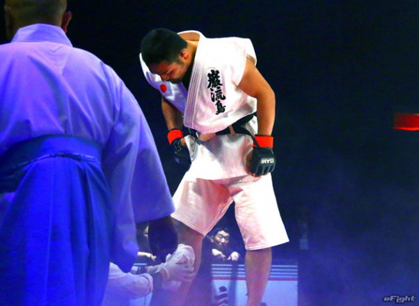 菊野(右)のローキックをスネでブロックしたアンブリッツ(左)。これで菊野のスネが割れた