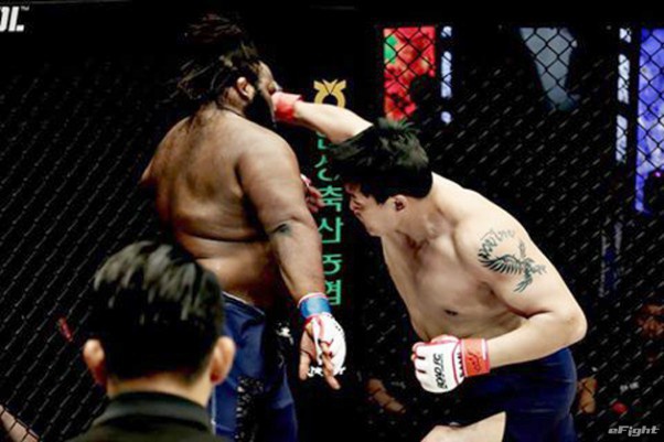 バーネット(左)の顔面に強烈な右フックを炸裂させたヒョンマン(右)