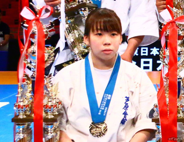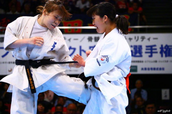 軽量級離れした威力のある突きを叩き込む菊川(右)