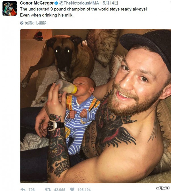 5月5日に誕生したばかりの長男を抱くマクレガー。 「9ポンド級世界王者はいつでも臨戦態勢だ」とツイート
