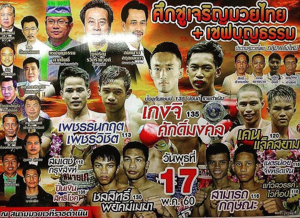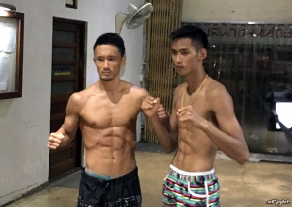計量をクリアーし、挑戦者サックモンコン(右)とポーズをとる梅野(左)
