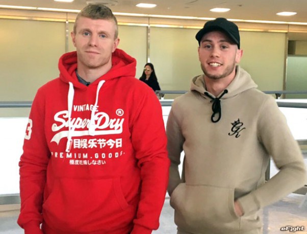 トレーナーと共に来日し、笑顔を見せる挑戦者シェーハン(右)