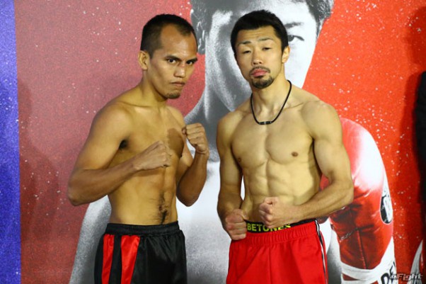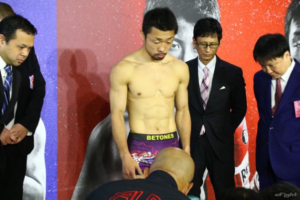 王者・八重樫(右)、挑戦者で暫定王者のミラン・メリンド(左)はともに計量を一発でクリアー