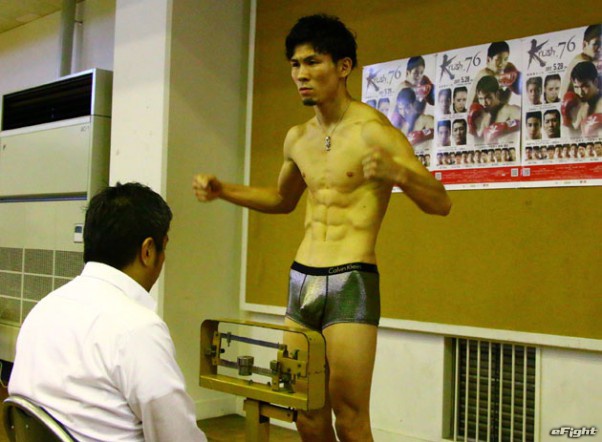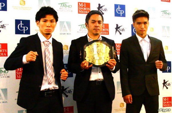 Krush -60kg王座を懸けて対戦するレオナ(左)と安保(右)。中央は宮田Krushプロデューサー