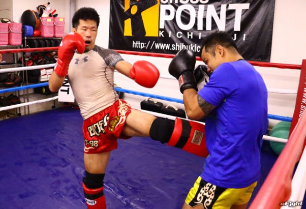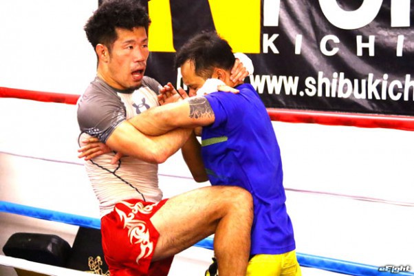 得意のローキックを繰り出すT-98(左)。ラジャ王座は失ったが、すぐに気持ちを切り替えたという