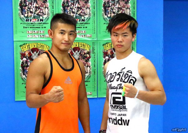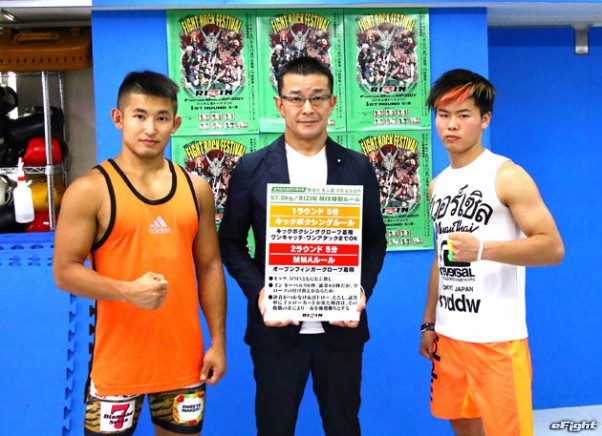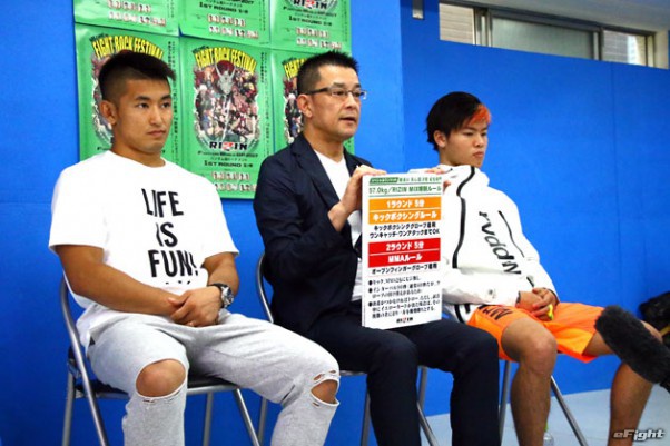 才賀(左)vs那須川(右)はファンが望む打撃戦、そしてお互いの持ち味を出すためのミックスルールに決定。中央は榊原実行委員長