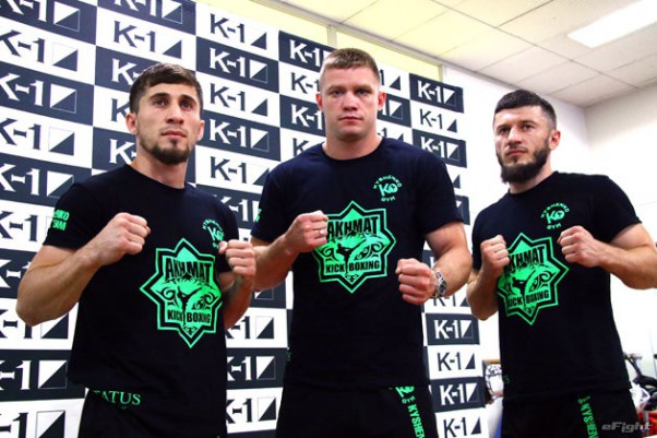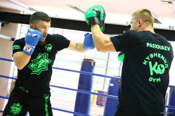キシェンコ(左)の持つミットへ重いパンチを打ち込むブバイサ(右)。武尊と打ち合うか