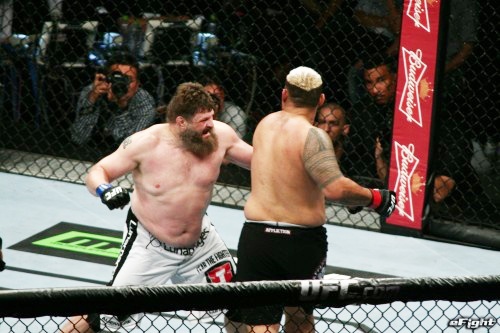 ロイネルソン(左)がマークハントと打ち合う=2014年9月UFC JAPAN